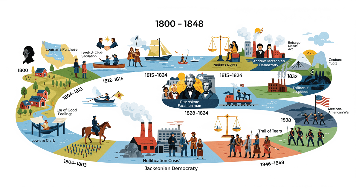 Travel from 1800 to 1848 and uncover the dramatic political, economic, and social transformations that shaped early 19th-century America. This unit covers the Louisiana Purchase, the War of 1812, the Market Revolution, the Second Great Awakening, rising reform movements, Jacksonian democracy, and the growing sectional tensions over slavery. Perfect for AP US History students, this guide gives clear themes, exam-focused tips, and study strategies so you can connect facts to the big-picture arguments graders look for.